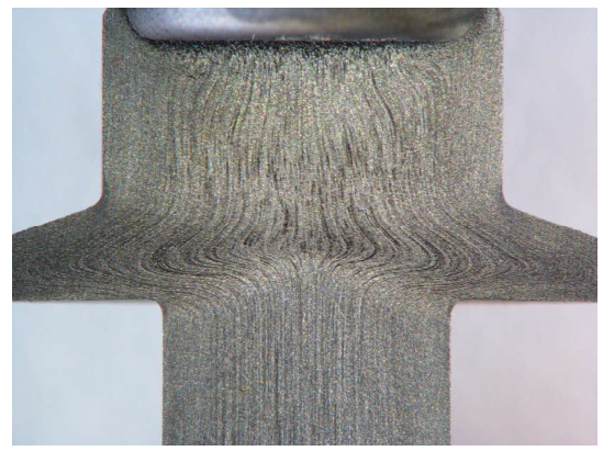 注:腐蝕后,金剛石砂輪上的輕微“暴露”拋光會(huì)消除流線脊上的一些凸起區(qū)域。該工藝改善了腐蝕流線較暗根部與光亮或拋光波峰之間的對(duì)比度,來改進(jìn)評(píng)估。