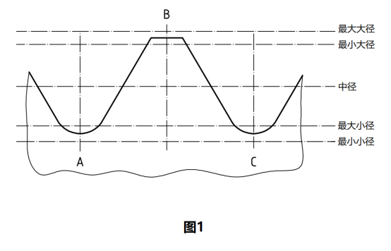 完全成形的螺紋在1節(jié)的軸向距離(點(diǎn)A、點(diǎn)B、點(diǎn)C)內(nèi)具有符合設(shè)計(jì)輪廓的輪廓,在公差帶限制范圍內(nèi)。見圖1。