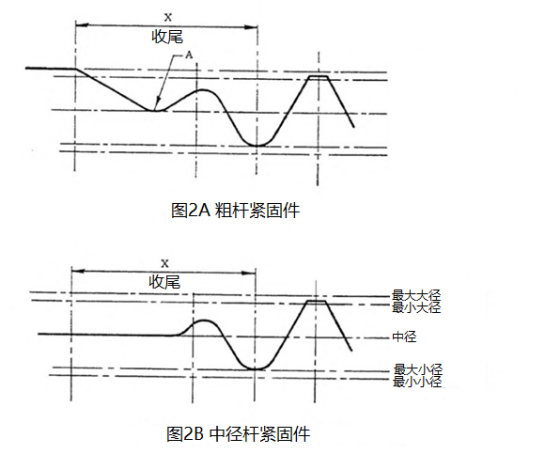 螺紋收尾位于螺桿的光桿部分末端(或頭下圓角)和第一個(gè)完全成形的螺紋根部之間,其中小徑不大于最大小徑。見圖2A和2B。