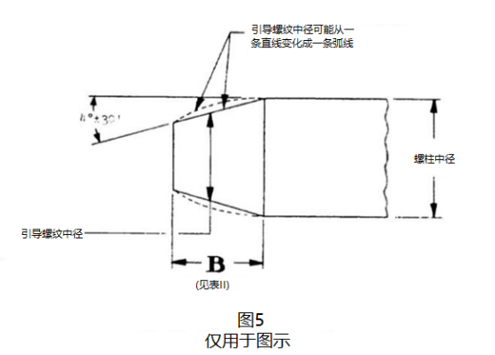 3.2.2雙頭螺柱引導(dǎo)螺紋:如圖4所示,如果需要錐形引導(dǎo)螺紋,則雙頭螺柱端部引導(dǎo)螺紋的中徑應(yīng)從全螺紋的雙頭螺柱中徑開始,并繼續(xù)減小表II中規(guī)定的距離B。見圖5。