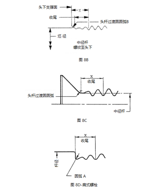 3.3.7帶肩螺栓的螺紋收尾:帶肩螺栓的桿徑和跳動(dòng)X端部與螺紋小直徑之間的過渡段應(yīng)具有如圖8D所示的3.3.4.1中所述的半徑A,位于軸肩與內(nèi)凹和不完整螺紋的接合處。