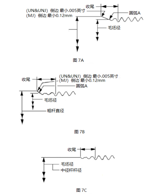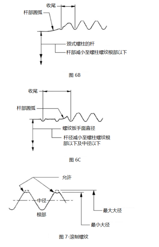 3.3.5螺紋收尾,中徑桿緊固件:與螺紋毛坯直徑相當(dāng)?shù)?/span>中徑桿部件,其螺紋滾制應(yīng)具有0.6個(gè)螺紋螺距和最大2個(gè)螺距的最小螺紋收尾。見圖7C